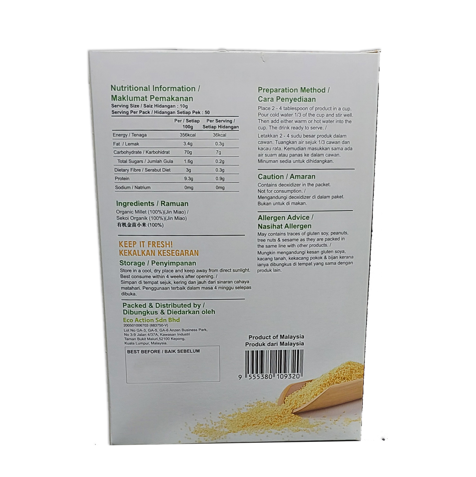 Organic Millet provide host of nutrients, it is one of the few grains that is alkalizing to the body and easily digest. Rich in Protein and Fiber, Aid in Digestion, Gluten Free Rich source of vitamins and minerals like magnesium, phosphorous, iron, calcium, potassium and zinc You may mix with other beverages or oat to consume. Alternatively put 2 – 3 tablespoon into cup and mix 1 / 3 cup of water in warm / hot or cold water, stir well evenly before adding balance 2 / 3 of water.
